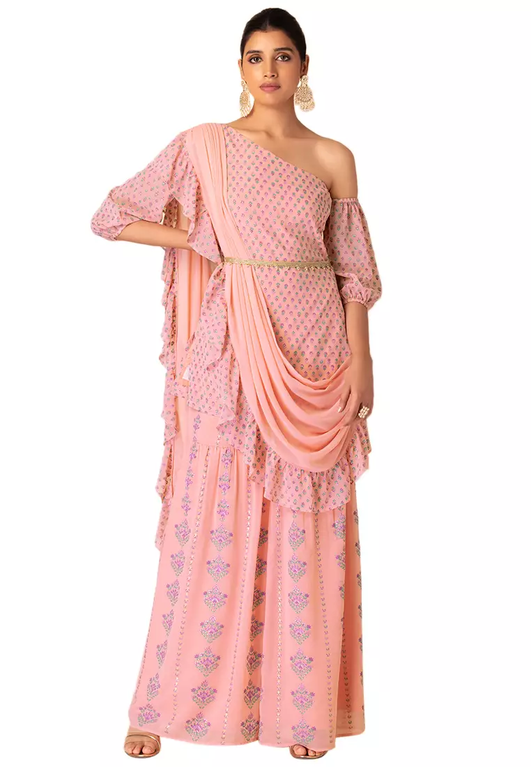 IndyaPastel Pink Floral Print Sharara And Short Kurta With Attached Ruffled Dupatta And Belt (Set of 3)7714.002699.90