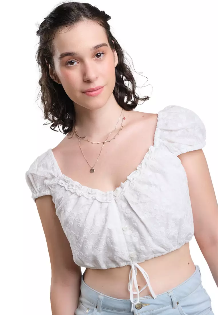 Embroidered Cotton Cropped Blouse With Puff Sleeves