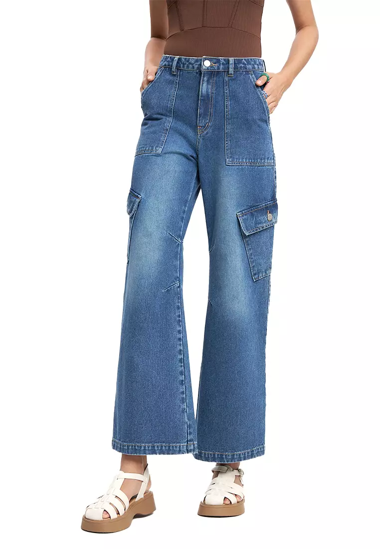 High Rise Denim Cargo Wide Leg Jeans