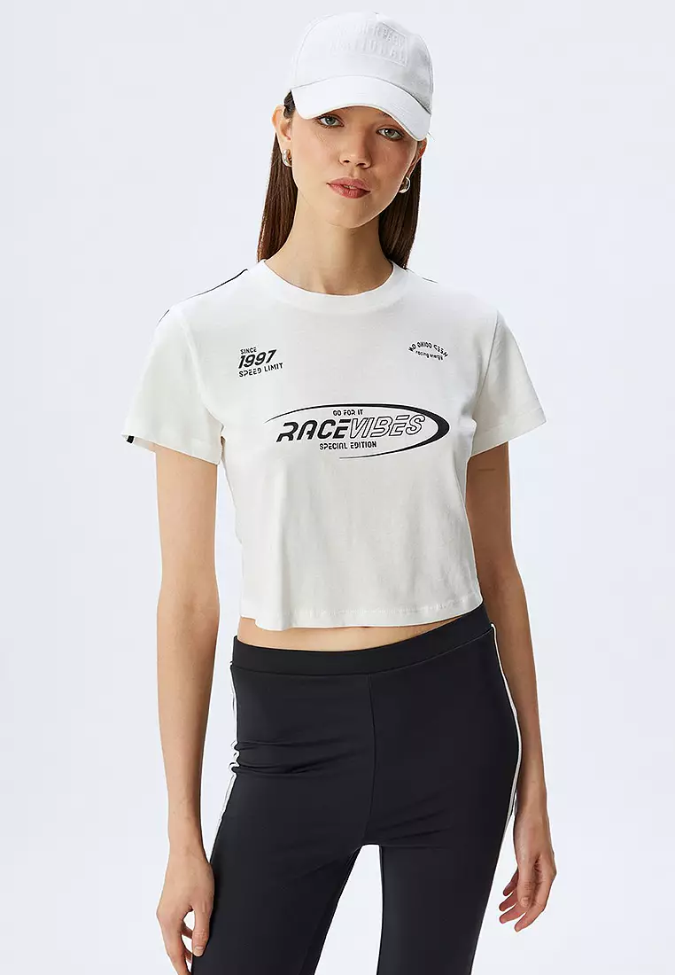 Crop Printed Bias Crew Neck Short Sleeve Cotton T-Shirt