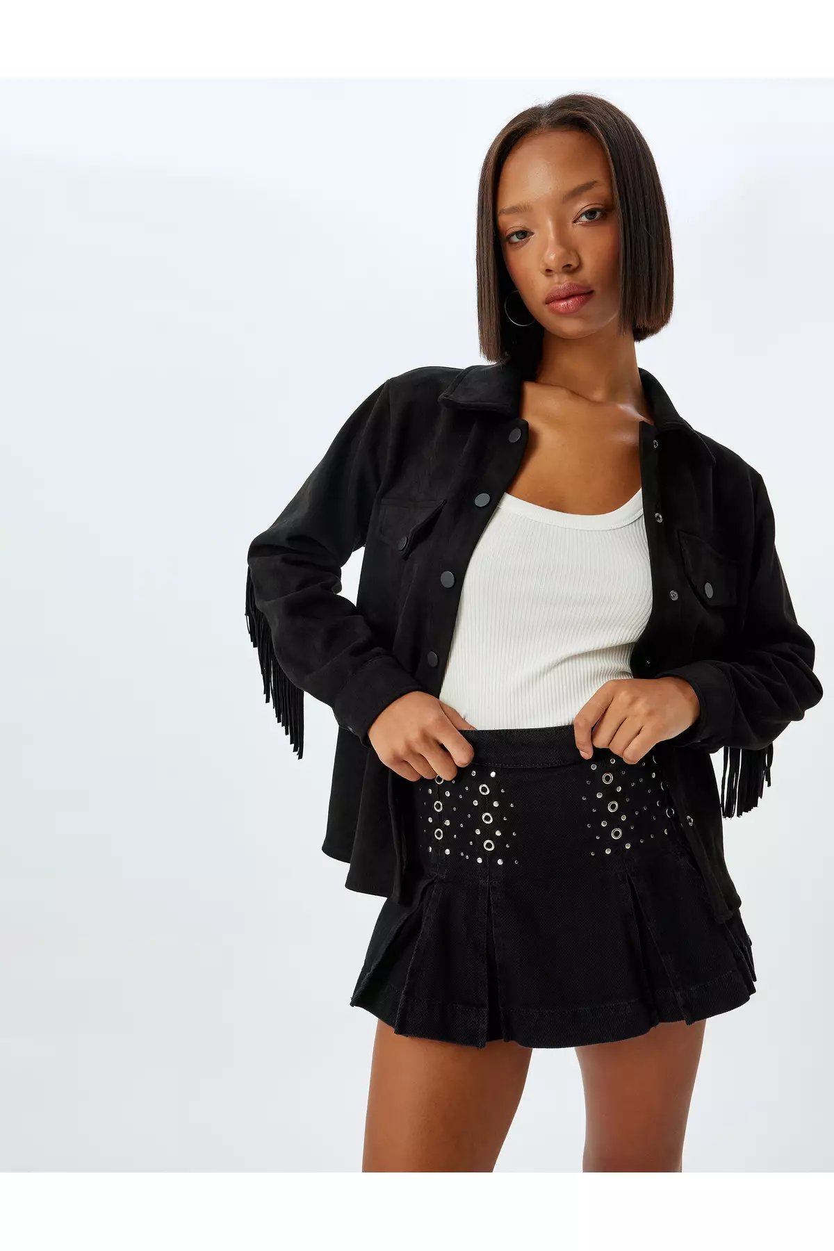 Mini Denim Shorts Skirt Pleated Eyelet Detail