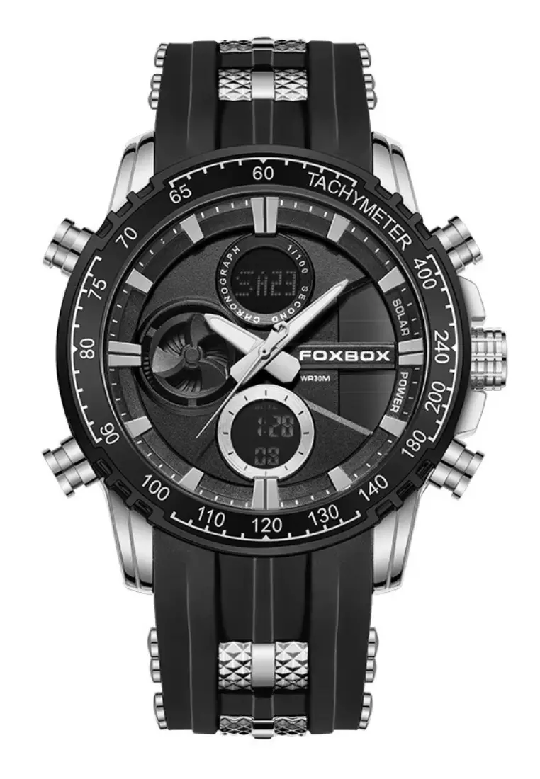 FOXBOX Unisex Analogue/Digital Chronograph Stainless Steel Quartz Watch, Black Dial, Silicone Bracelet
