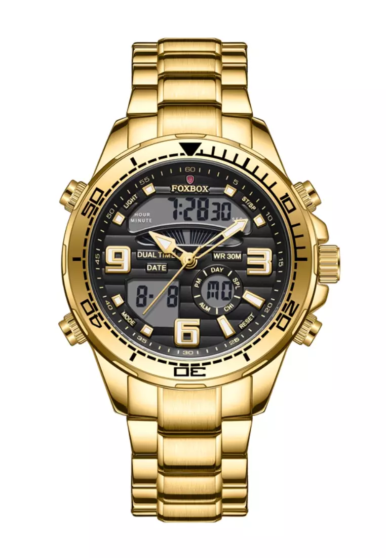 FOXBOX Unisex Stainless Steel Diver's Analogue/Digital Quartz Watch, Black Dial, Stainless Steel Bracelet, 30m Water Resistant
