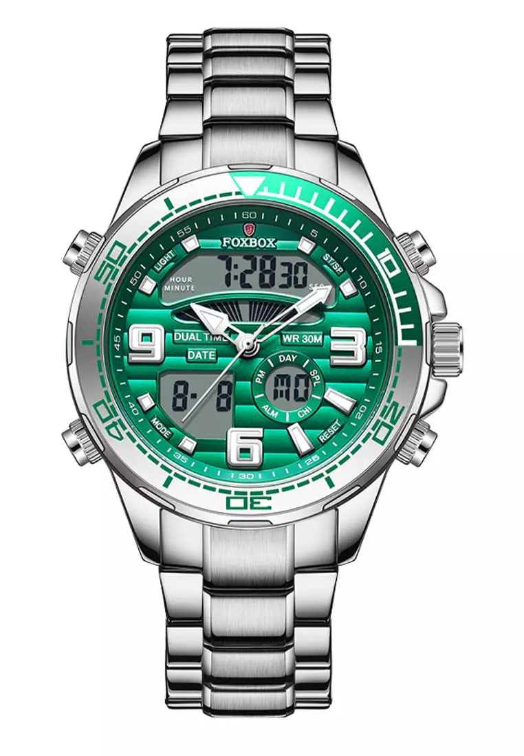 FOXBOX Unisex Stainless Steel Diver's Analogue/Digital Quartz Watch, Green Dial, Stainless Steel Bracelet, 30m Water Resistant
