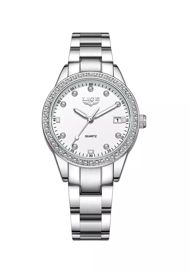 LIGELadies Light Weight Alloy Quartz Watch with Date, 34mm , Paved with Crystals, White Dial, Stainless Steel Bracelet12400.003099.00
