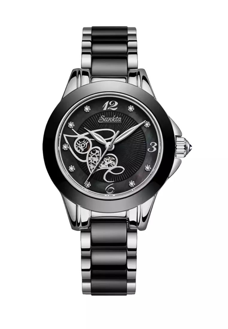 SUNKTA Black Ceramic "LOVE" Ladies Quartz Watch, 33mm, Stainless Steel, Black Dial, Metal Bracelet and Ceramic