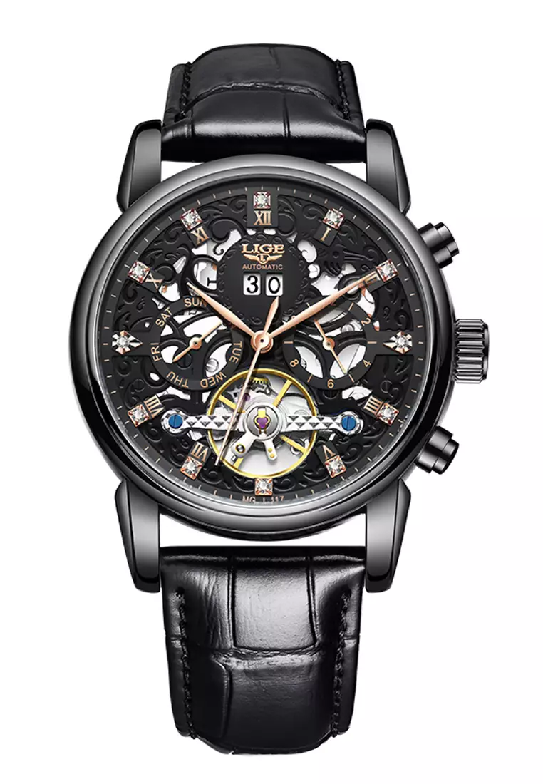 LIGEUnisex AUTOMATIC IP Black Stainless Steel Watch 42mm, Black Leather Strap22400.005599.00