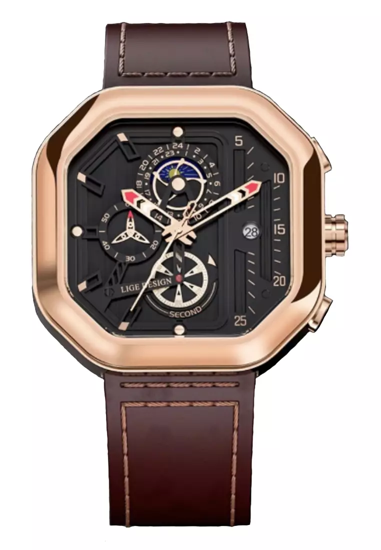 Unisex Chronograph Octogonal IP Pink Steel Quartz Watch on brown leather strap