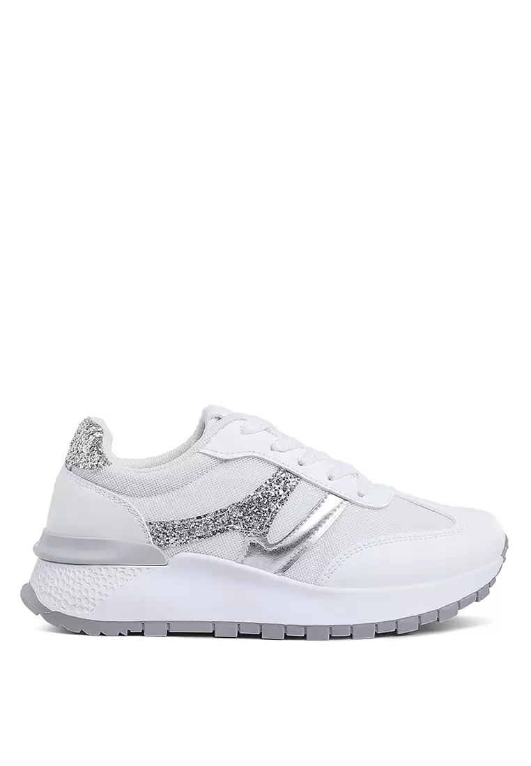Glitter Detail Chunky Sneakers in White & Silver