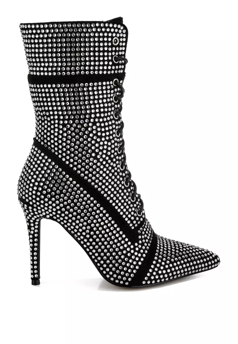 Rhinestones Embellished Calf Boots in Black