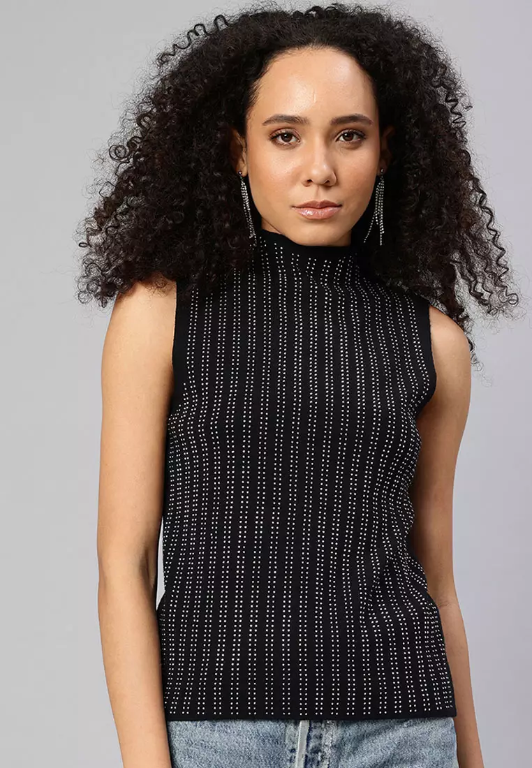 Sleeveless Sequin High Neck Top in Black