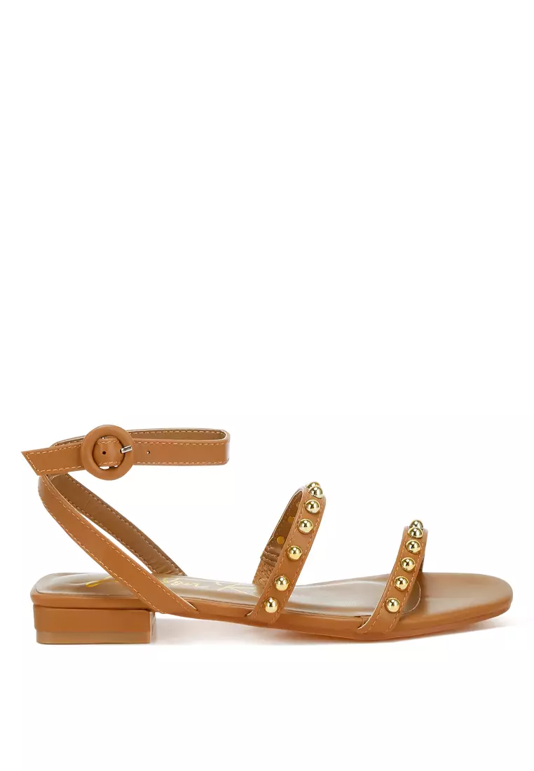 Studded Ankle Strap Flat Sandals in Tan