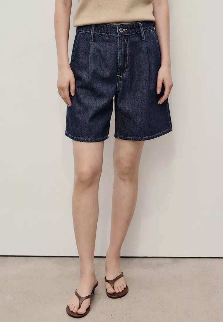 Mid-Rise Denim Bermuda Shorts With Pleats