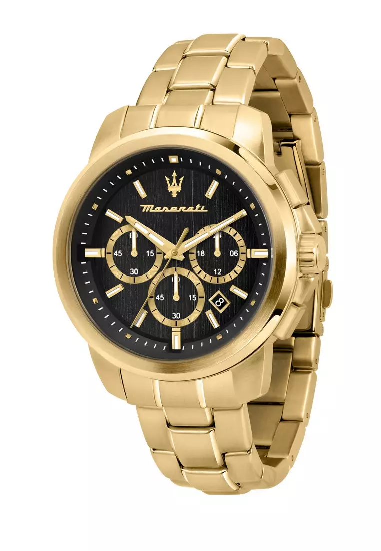 【2 Years Warranty】Maserati Successo - 44mm Black Dial Gold Stainless Steel Strap Men's Chronograph Quartz Watch R8873621013 With Luminous Dial Hands