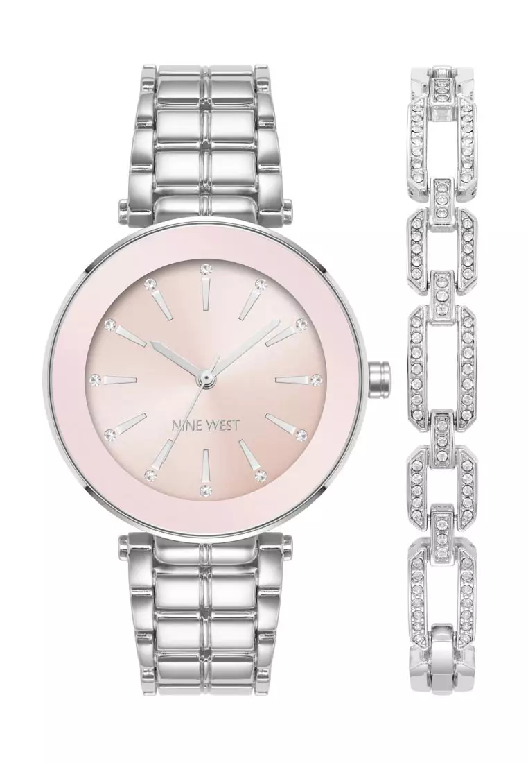 NW3135SVSTBOXL Silver Tone Round Watch With Light Pink Sunray Dial, And 1 Crystal Bracelet