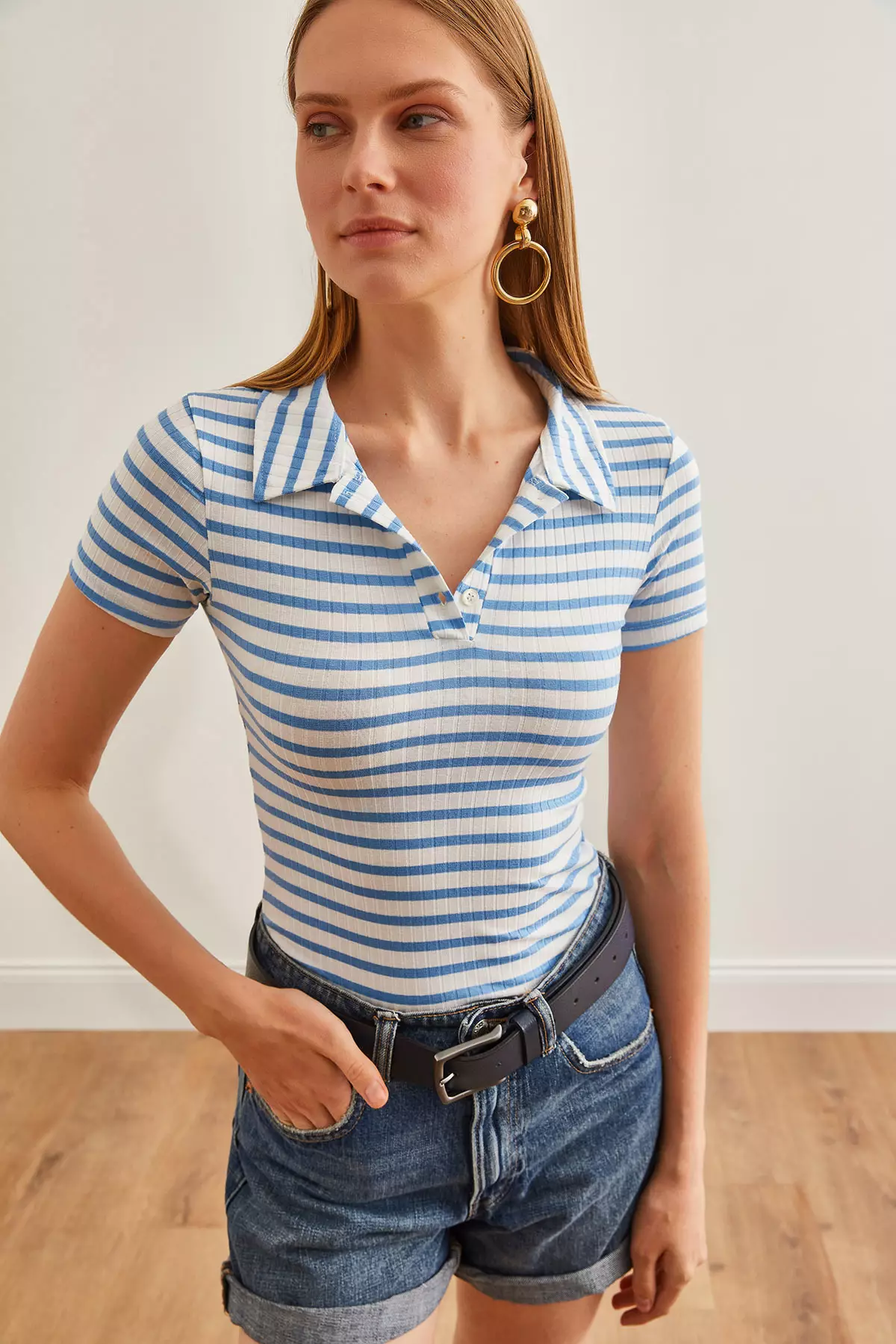 Baby Blue Polo Collar Lycra Women's Blouse - Thick Striped, Buttoned Blz-19002558
