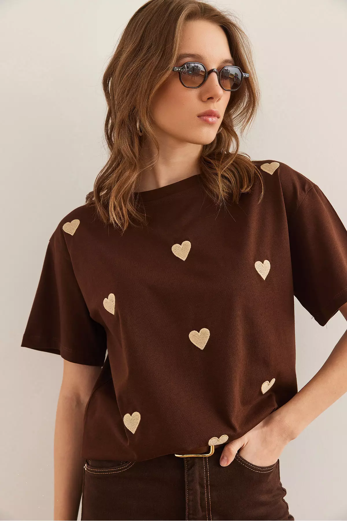 Women's Brown Heart Embroidered Cotton Regular Fit T-Shirt Tsh- 19000864