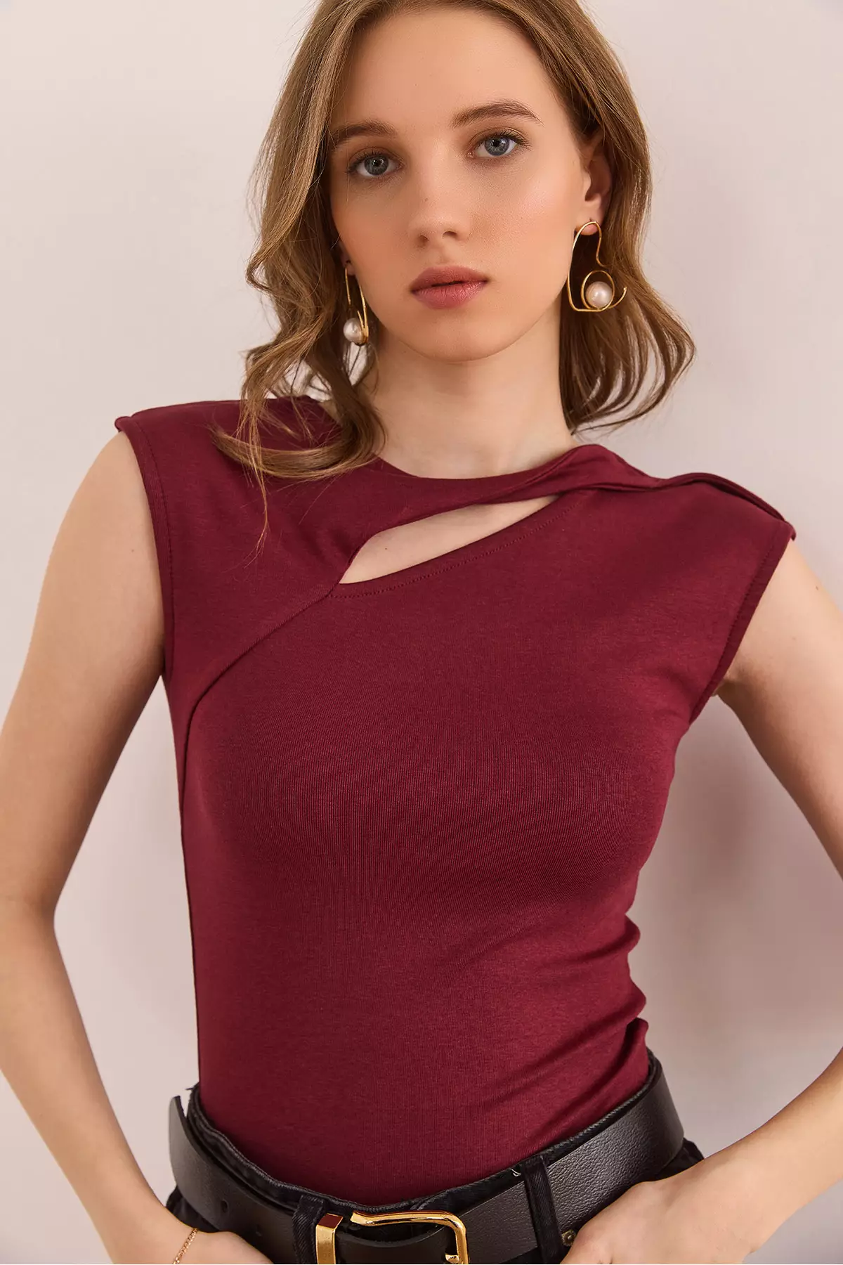 Women's Burgundy Drop Low-Cut Shoulder Detailed Cotton Modal Blouse Blz- 19002881