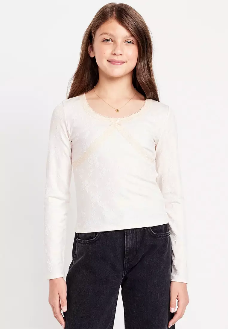 Fitted Long-Sleeve Lace-Trim Top for Girls