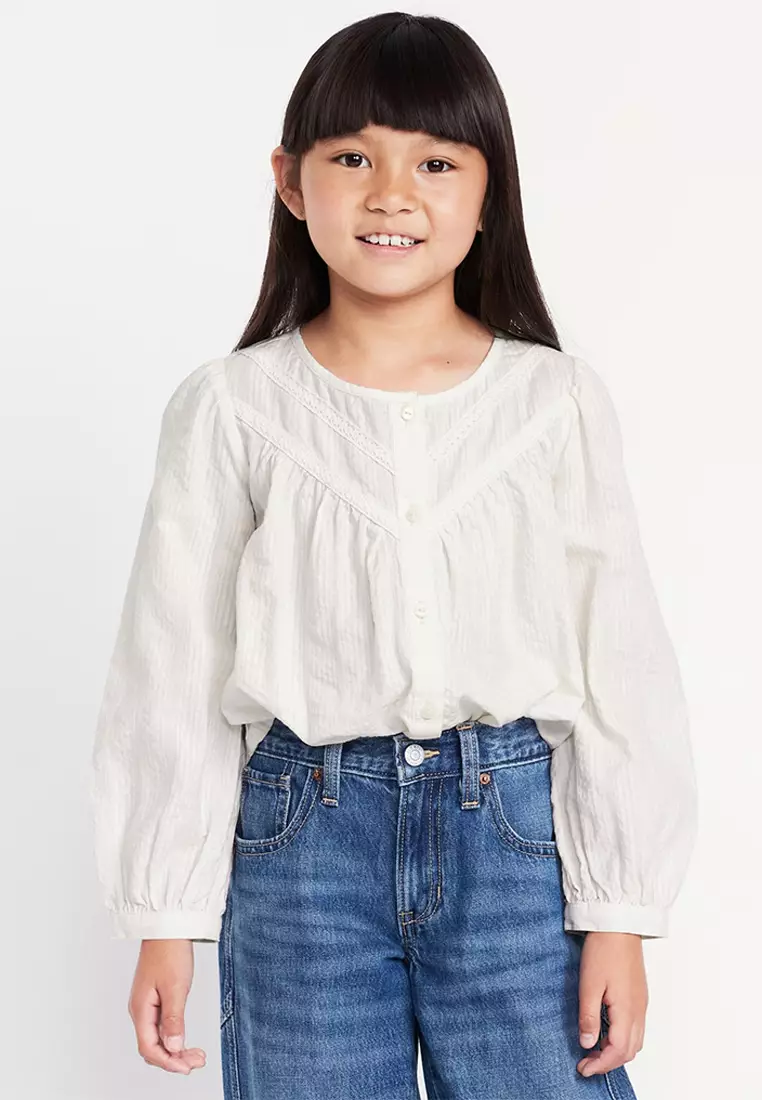 Long-Sleeve Lace Trim Button-Front Top for Girls