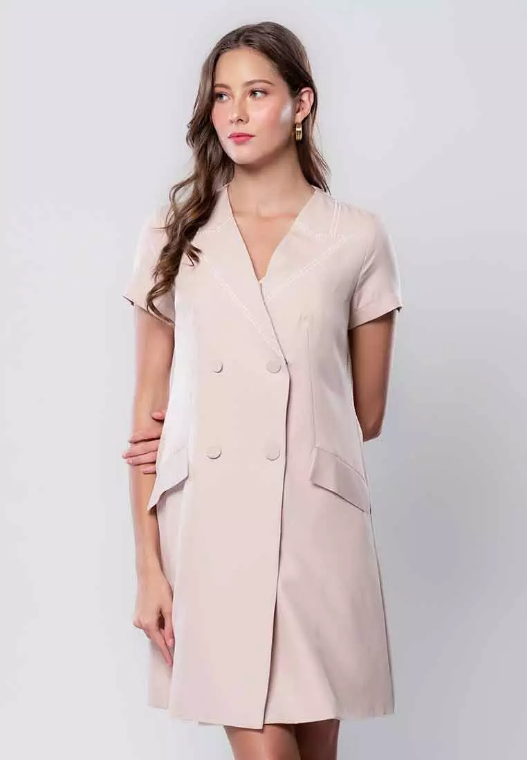 Aveline Double-breasted Dress with Embroidered Fake Collar Detail and Pockets