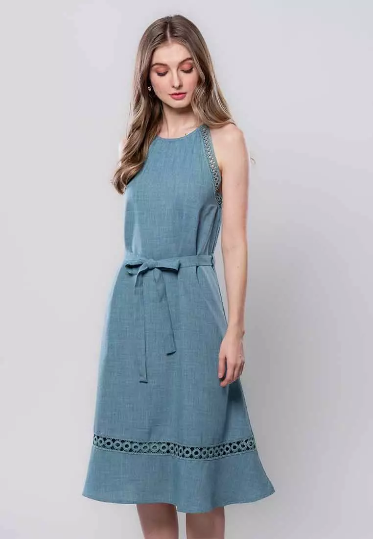 Rosaline Halter Sleeveless Dress with Trimming Detail and Sash Belt