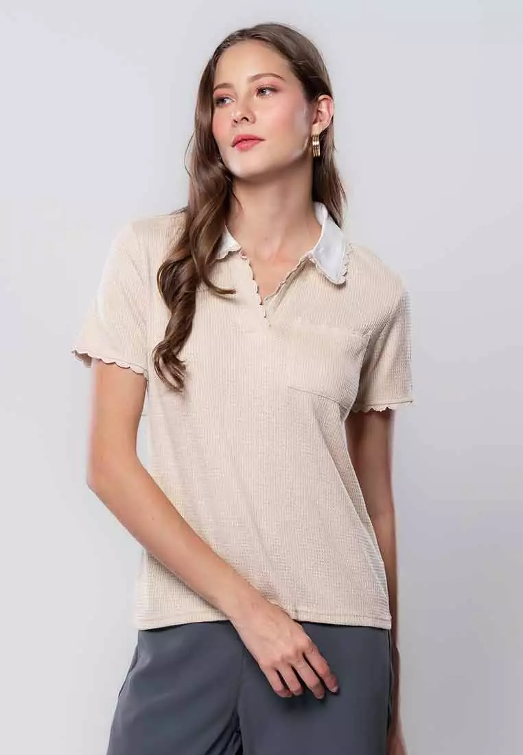 Ysabel Collared Knit Top with Scallop Trimming and Chest Pocket