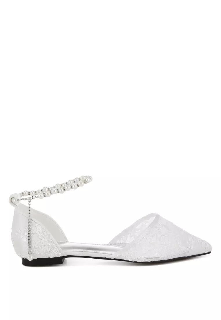 Pearl & Rhinestone Strap Flat Sandals in White