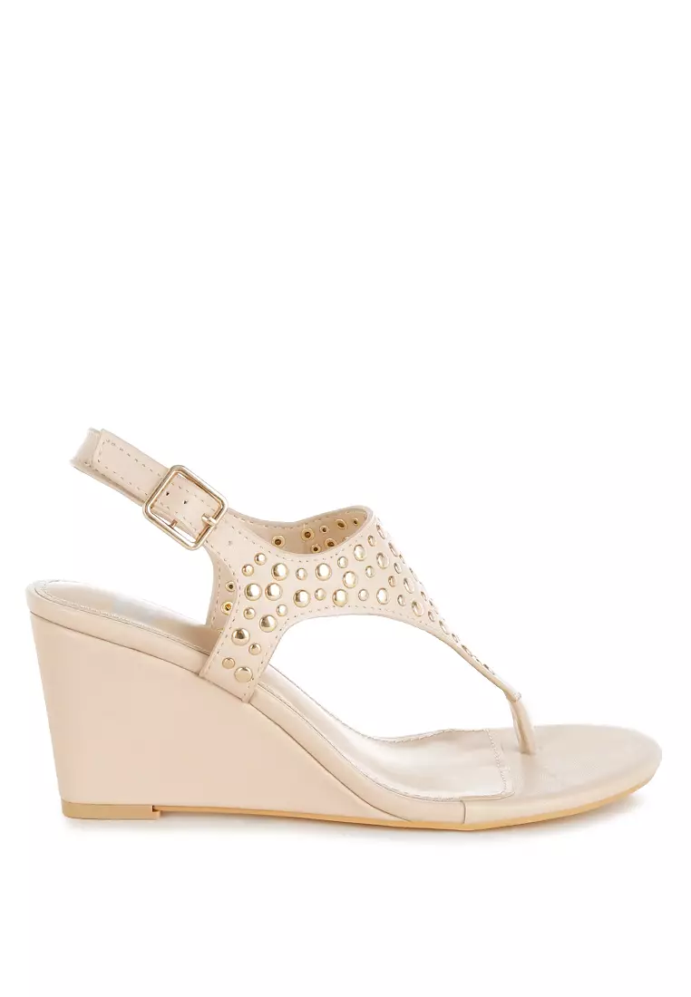 Studded Thong Toe Wedges in Beige