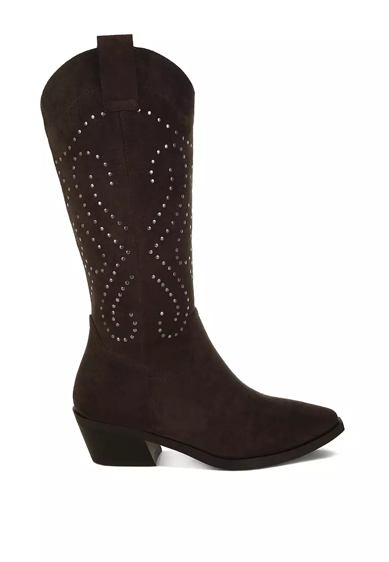 Studs Embellished Cowboy Boots in Brown