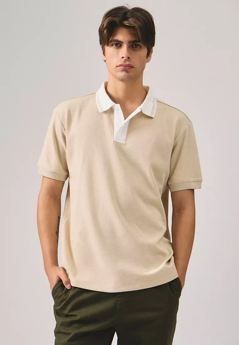 Regular Fit Polo Shirt With Contrast Placket & Collar In Honeycomb Pique