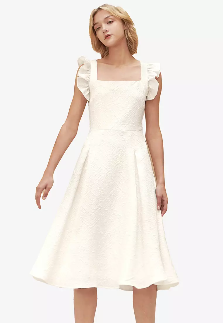 Square Neck Ruffled Detail Textured Midi Dress