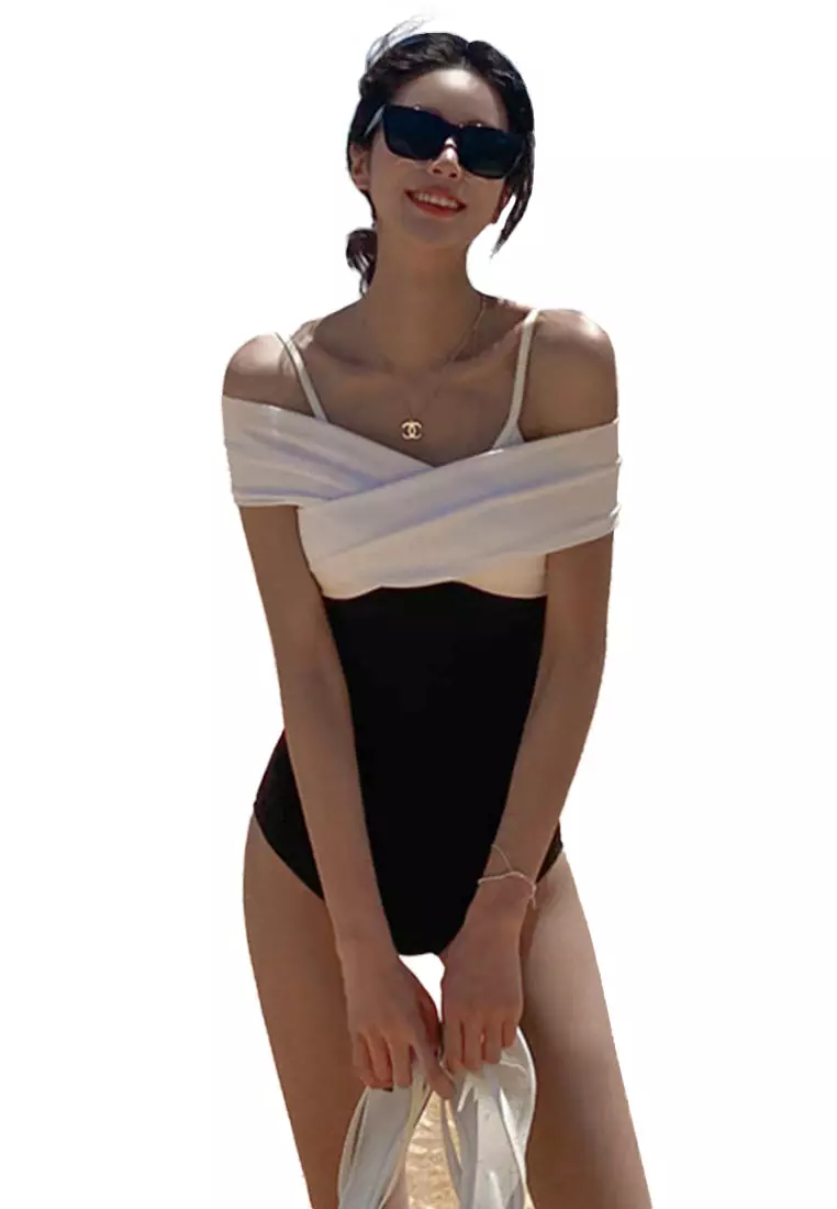 SunnydaysweetyOff Shoulder Black And White Contrast One Piece Swimsuit CA0717162680.00