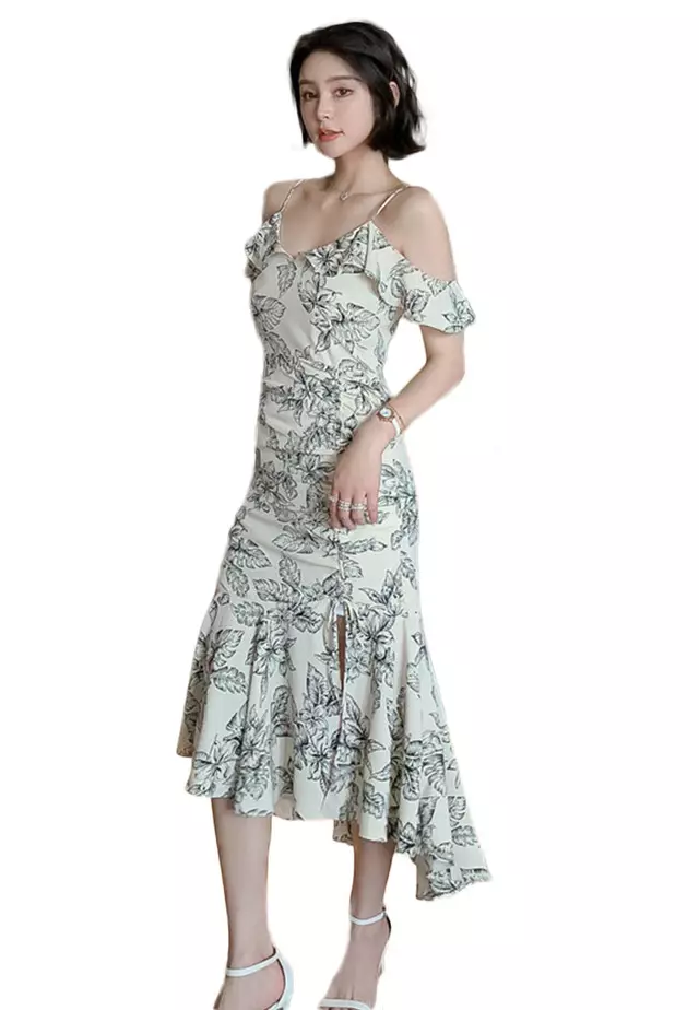 Sexy Ruffled Off-Shoulder Low-Cut Sling Floral One Piece Dress A21022255