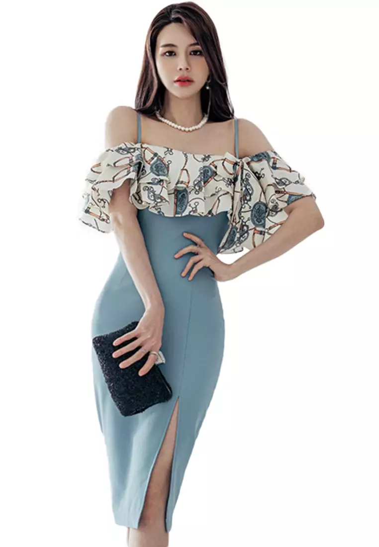 Sexy Suspender Print Ruffled Hip One Piece Dress A22022529