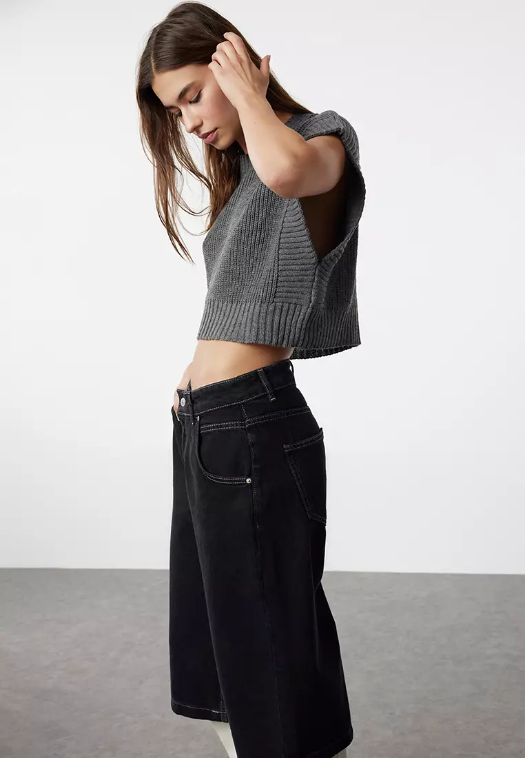 Anthracite Crop Crew Neck Knitwear Sweater TWOAW24SV00005
