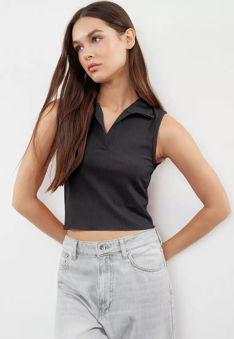 TrendyolAnthracite Fitted Polo Collar Crop Flexible Knitted Blouse769.00