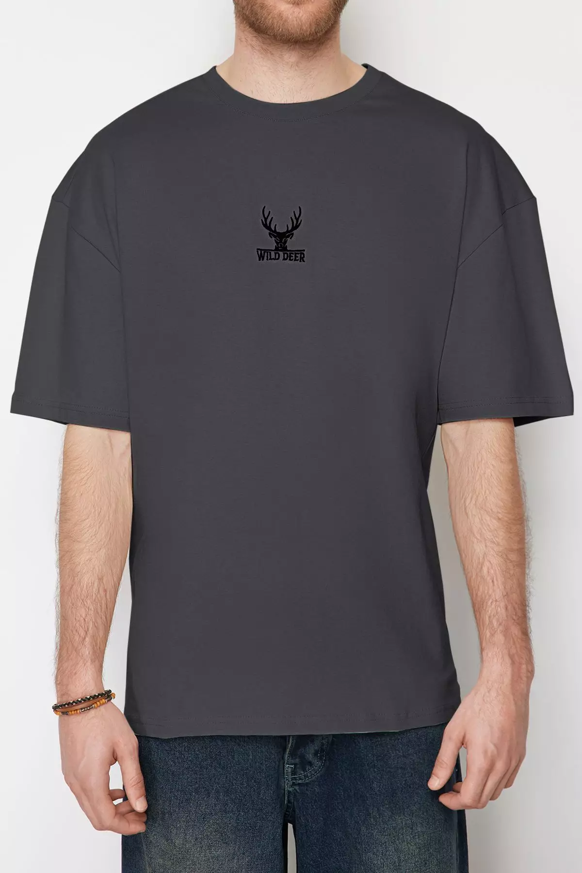 TrendyolAnthracite Oversize/Wide Cut Deer Embroidered 100% T-Shirt TMNSS24TS000552669.001155.90
