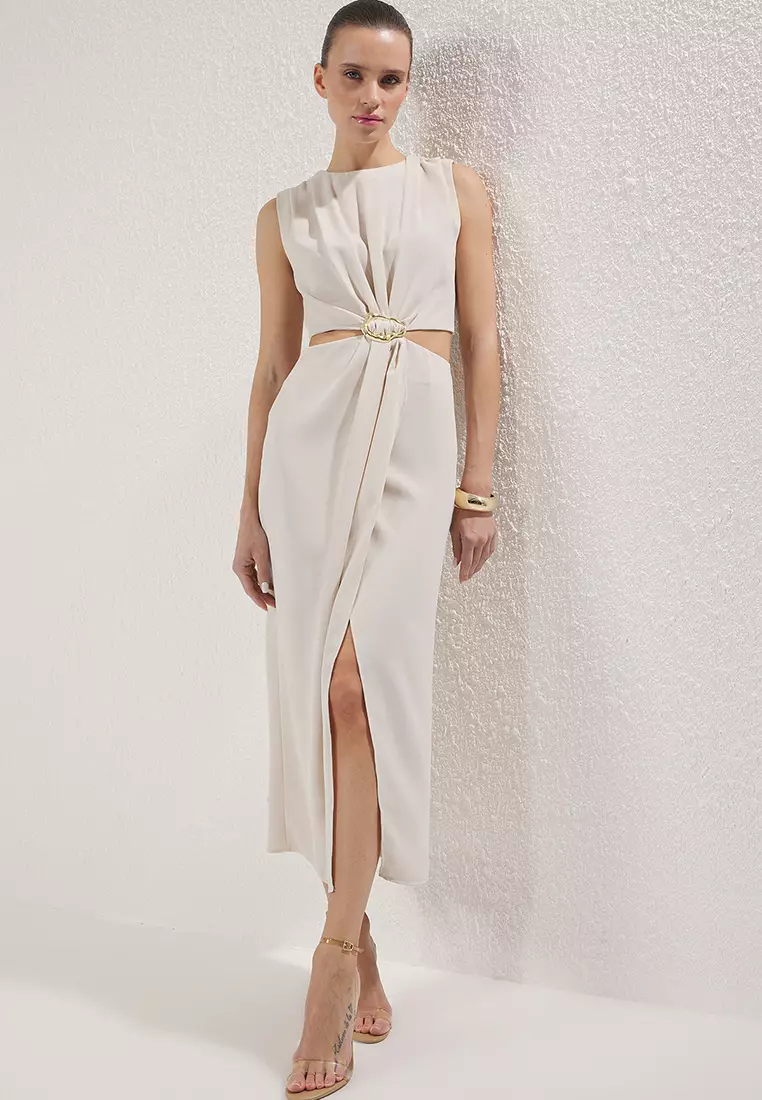 Beige A-Line Cut Out and Accessory Detailed Maxi Woven Crepe Dress TWOSS25EL00017