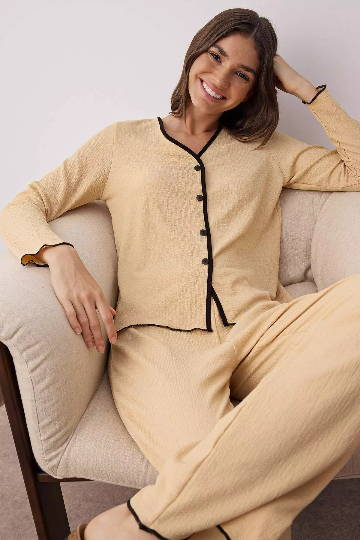 TrendyolBeige Buttoned And Piping Textured Crepe Knit Pajama Set Thmaw26Pt000972099.001335.00