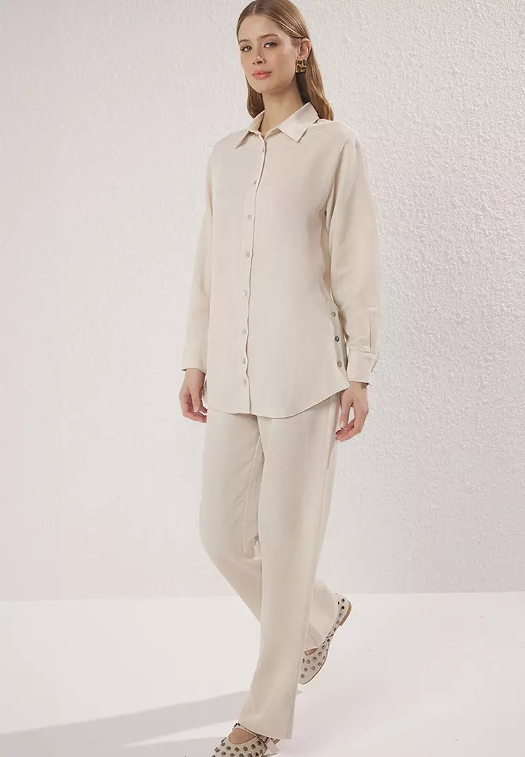 TrendyolBeige Linen Look Mother-of-Pearl Buttoned Woven Bottom-Top Set TCTSS25US000293929.003466.90