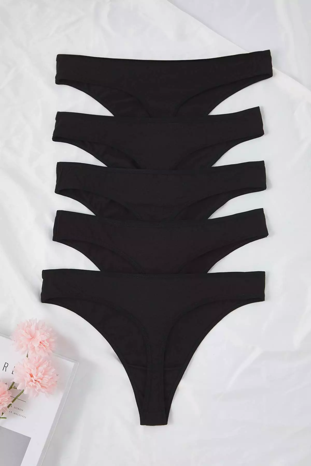 Black 5-Pack Cotton Normal Waist Thong Plus Size Panties