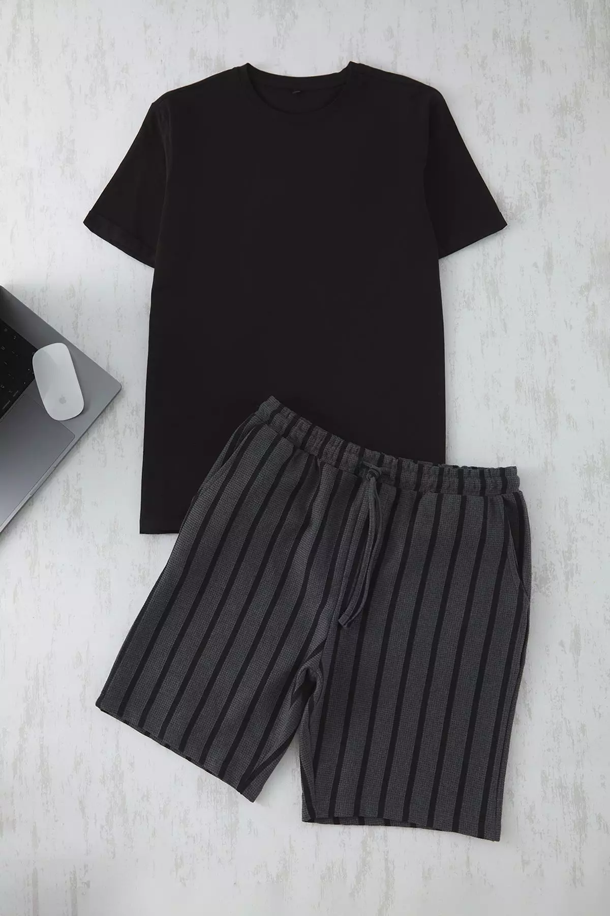 Black - Anthracite Regular Fit Striped Knitted Shorts Pajama Set TMNSS25PT00029