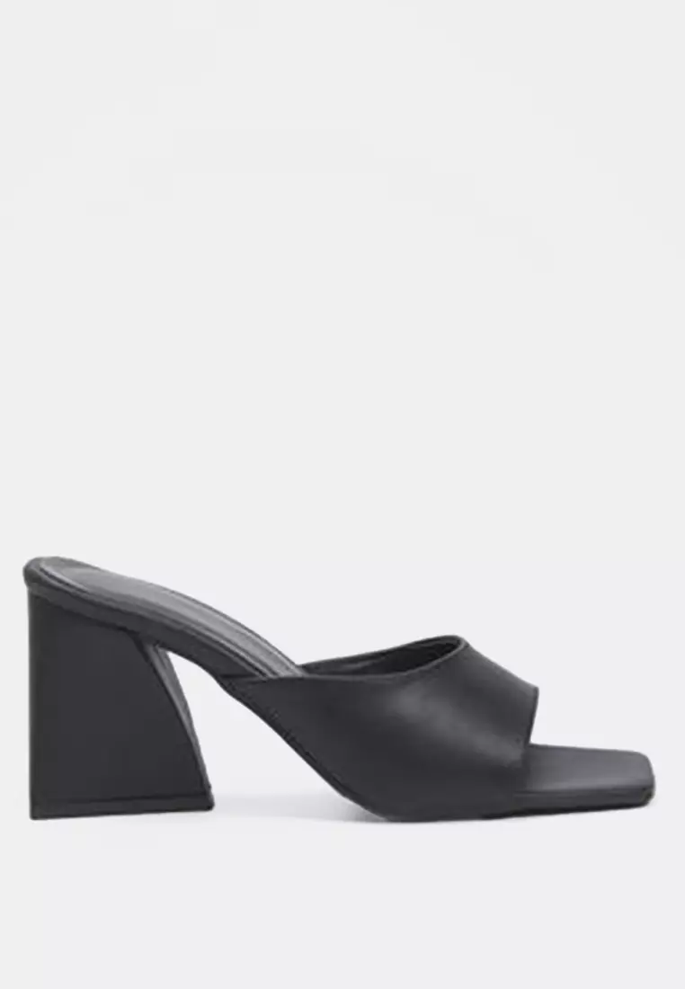 Black Asymmetric Block Heeled Thick Banded Square Toe Women's Heeled Slippers Takss25To00009