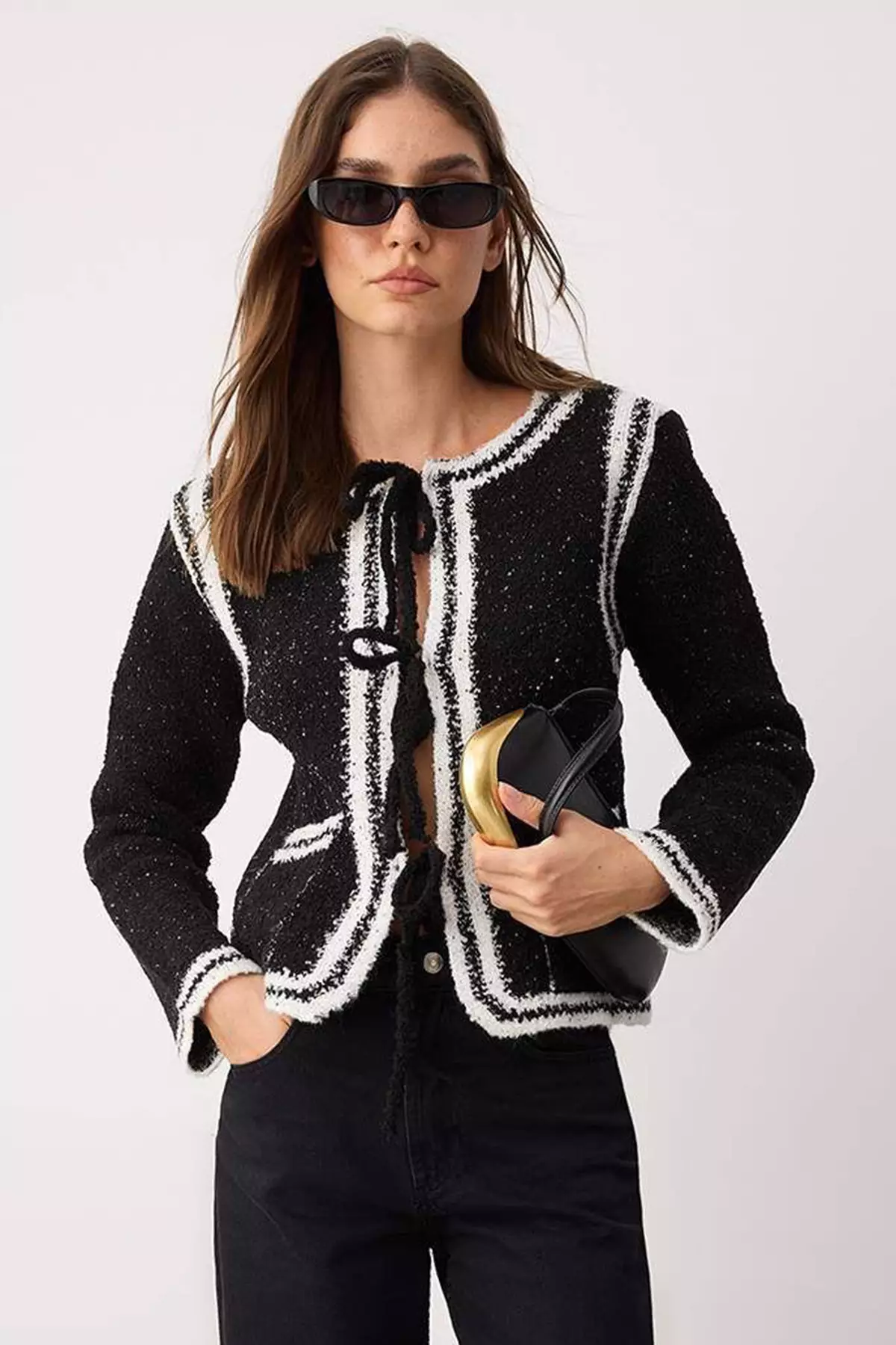 Black Block Processing Detailed Glitter Knitwear Cardigan