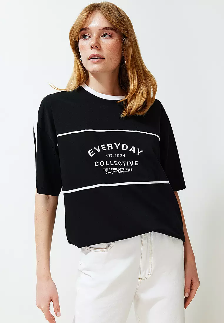 TrendyolBlack Color Block Slogan Oversize/Wide Fit Knitted T-Shirt979.00