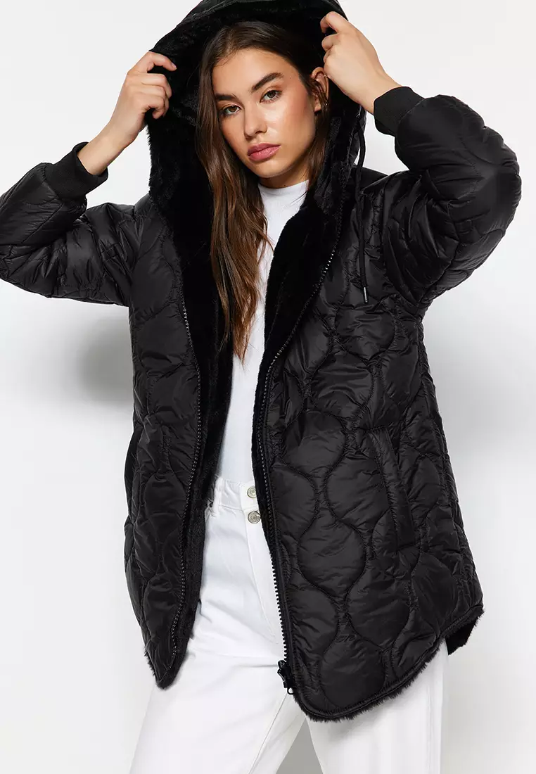 Black Double-Sided Wearable Hooded Plush Quilted Puffer Jacket TWOAW24MO00018