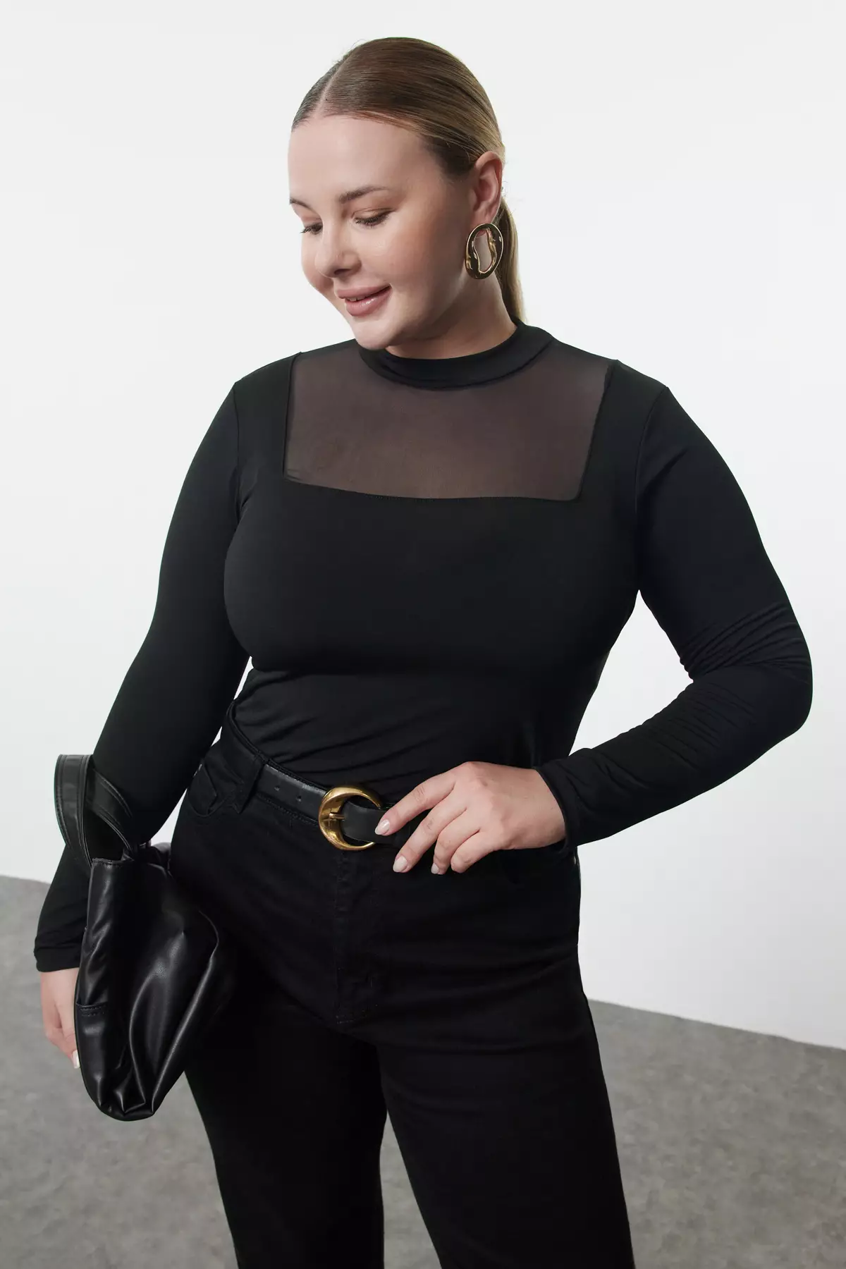 TrendyolBlack Fitted/Fits The Body Tulle Detailed Long Sleeve Stand Collar Flexible Snap Knitted Bodysuit1399.00895.00