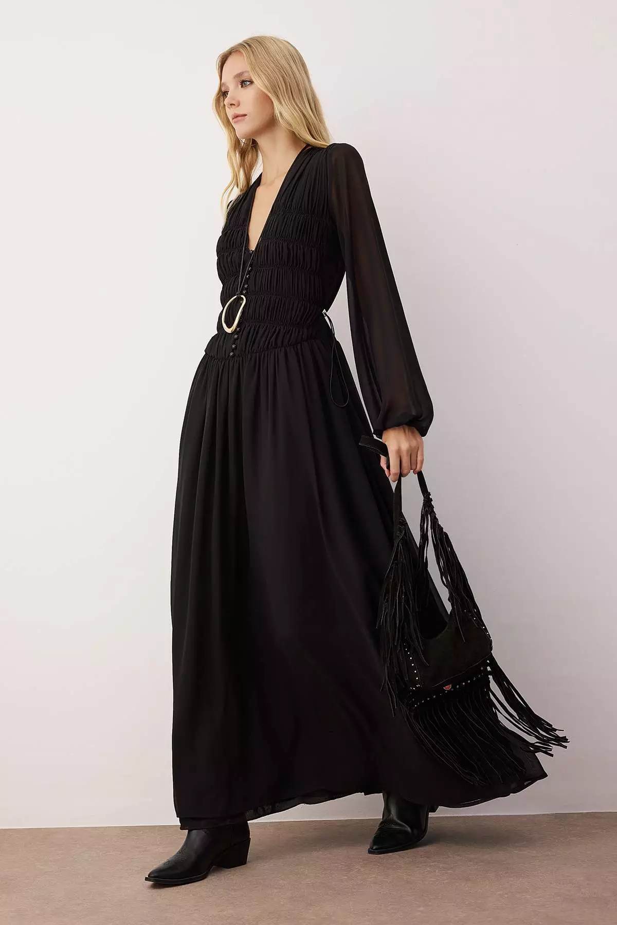 Black Gathered Detailed V-Neck Maxi Lined Chiffon Woven Dress