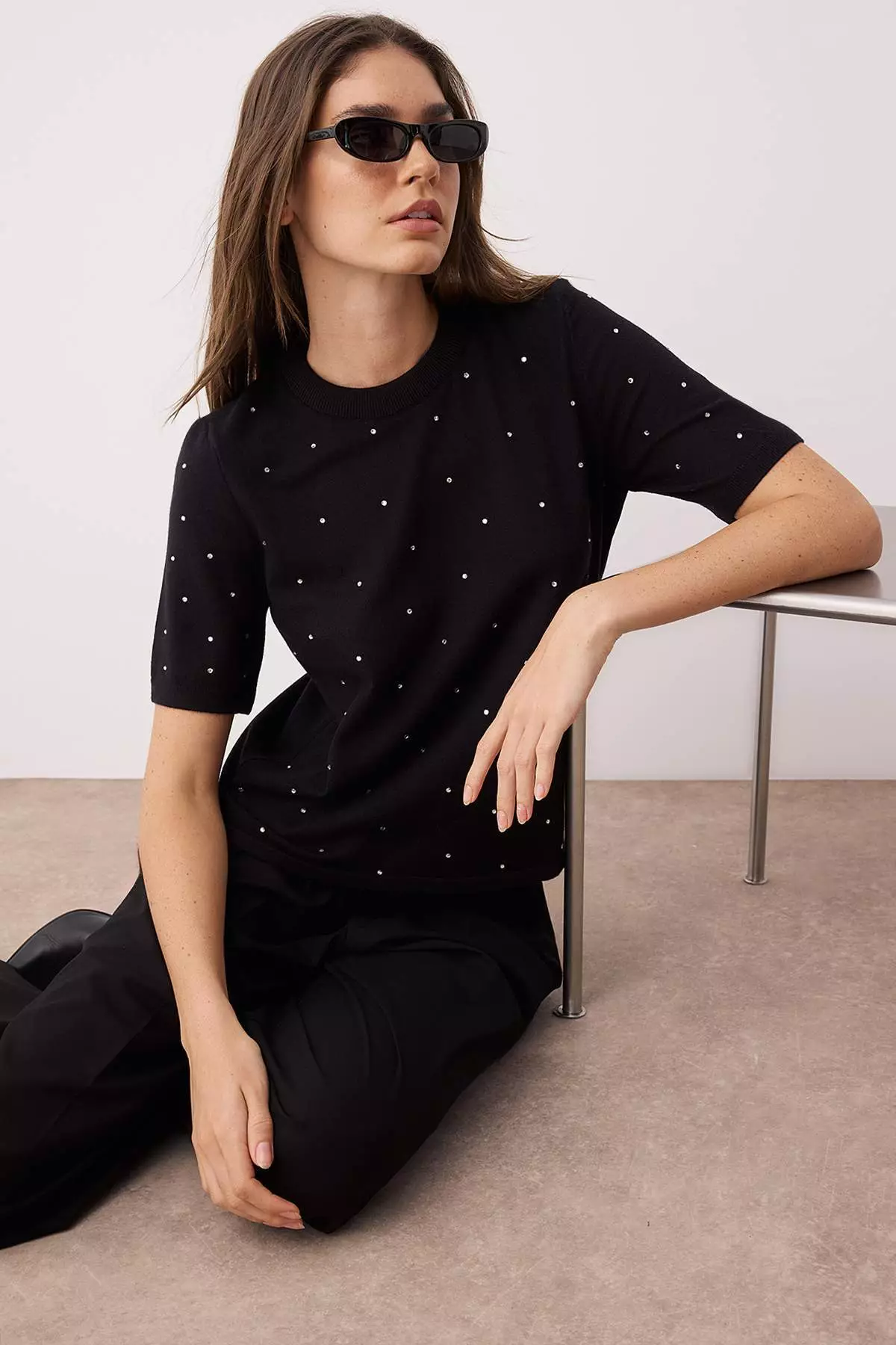 Black Premium Yarn/Special Yarn Stone Processing Detailed Knitwear Sweater